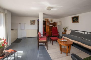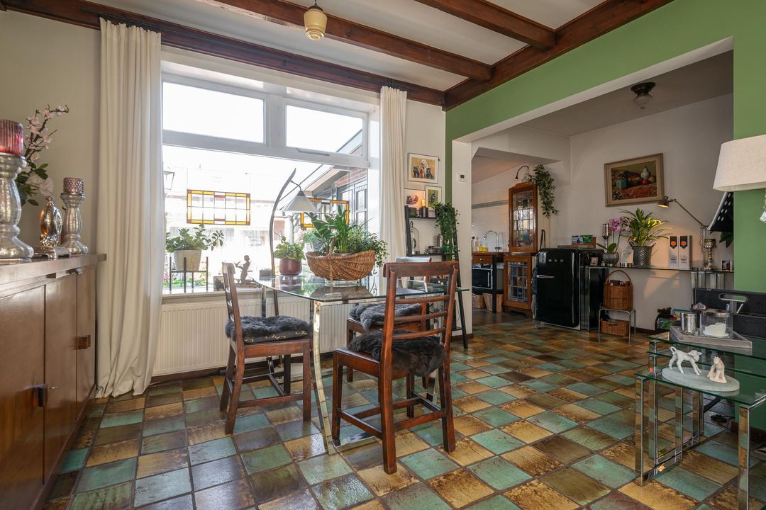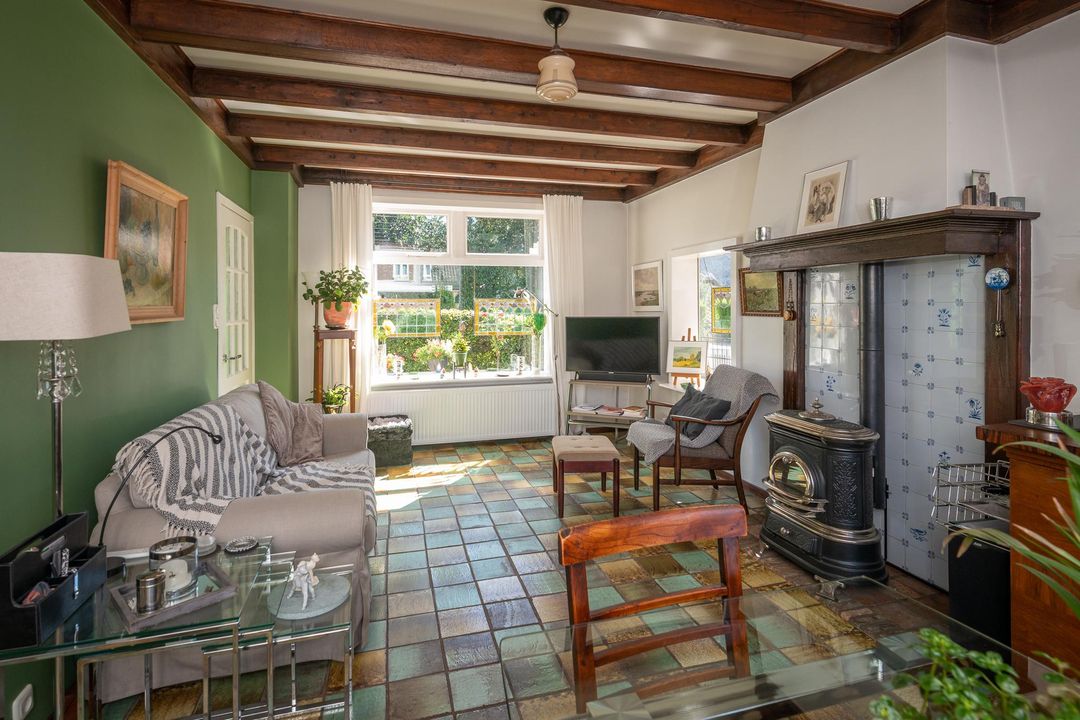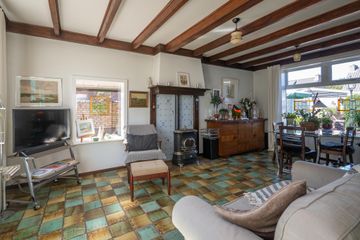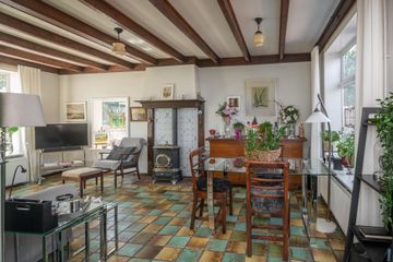 • Sfeervolle woon-/eetkamer met plavuizen vloer, schouw en kachel